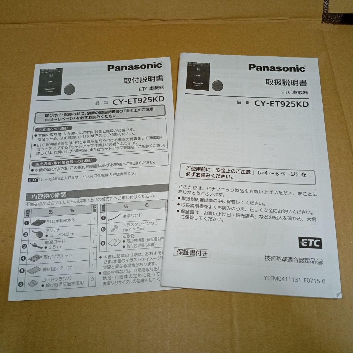> Panasonic パナソニック ETC車載器 CY-ET925KD用の取説 取扱書 取扱説明書 取付説明書 セット マニュアル 中古品
