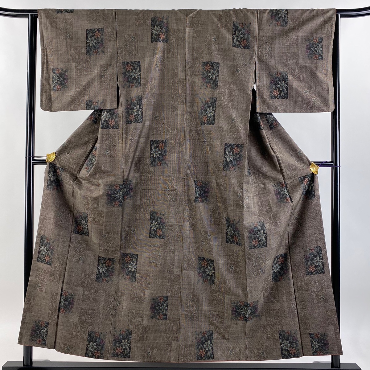 > 紬 身丈155cm 裄丈63.5cm S 袷 色紙 草花 焦茶色 正絹 優品 【中古】