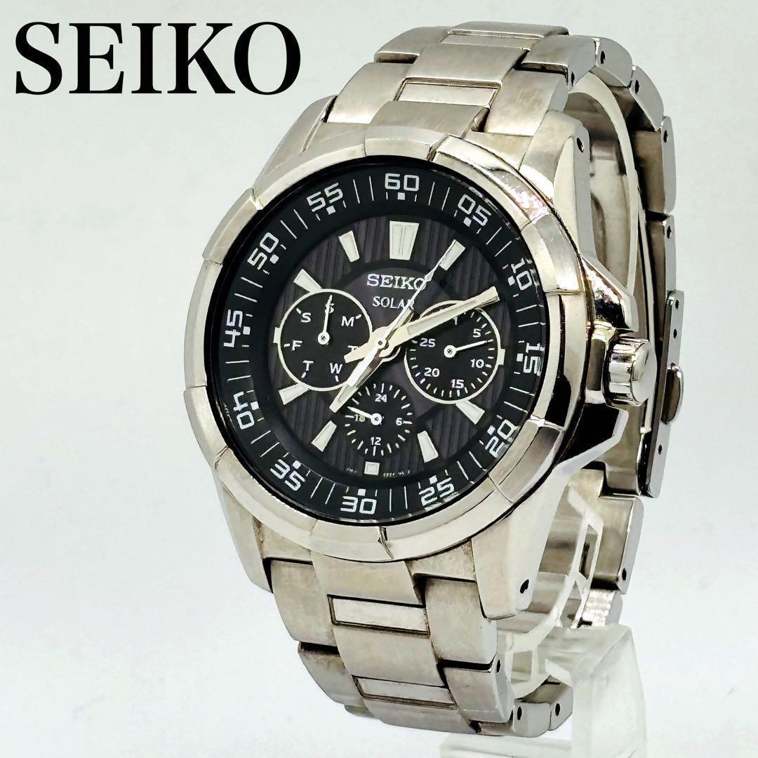 > 【レア】 セイコー V14J-0BB0 シルバー ブラック 動作良好 腕時計 SEIKO メタルバンド 銀 デイデイト ソーラー充電