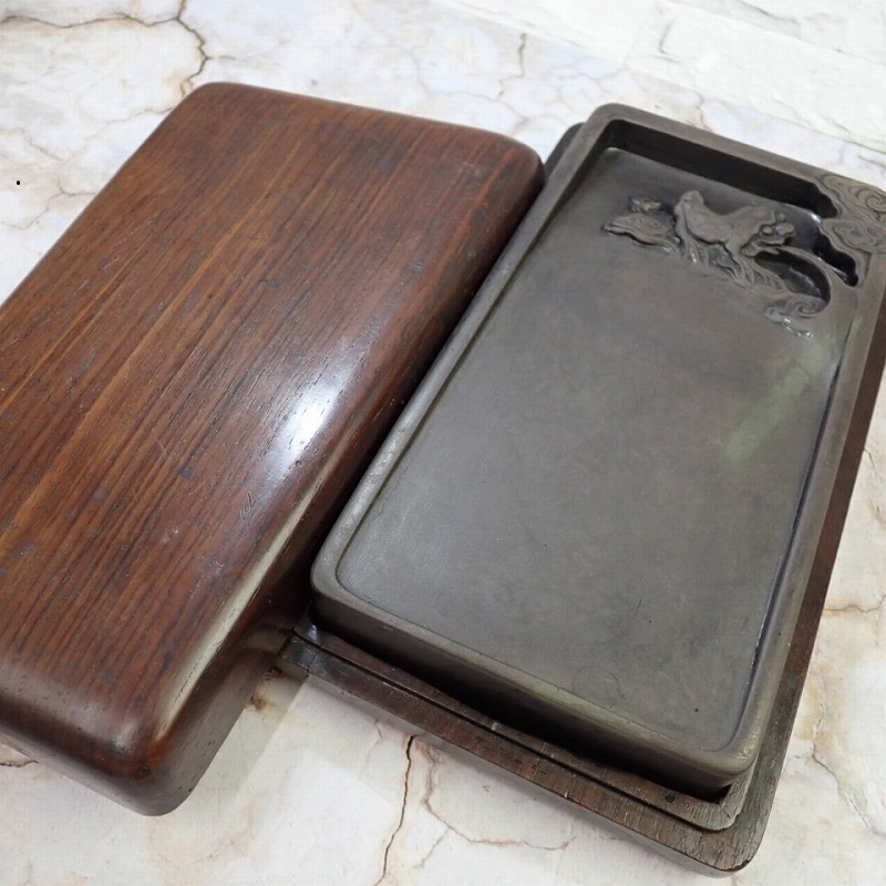 - ●FK-4336 中国古玩 古硯 古端渓 金線 細密彫刻 唐木ケース付 20250909