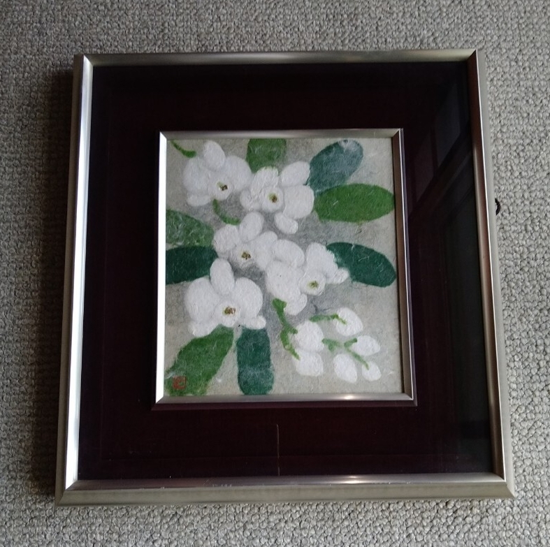 - 【お買得 ※額縁も魅力】花を描いた和紙工芸 貼り絵 日本画 パネル ビロードマット付きガラス額入り “一生”の落款有 真作か模写か不明