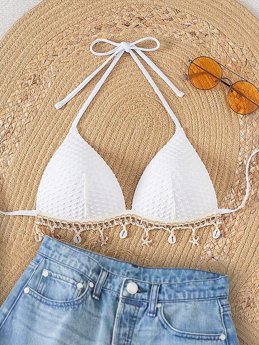 - レディース 水着 トップス 女性用 スプリングブレイク ソリッドカラー テクスチャ生地 ストラップデコレーション ホルターネック