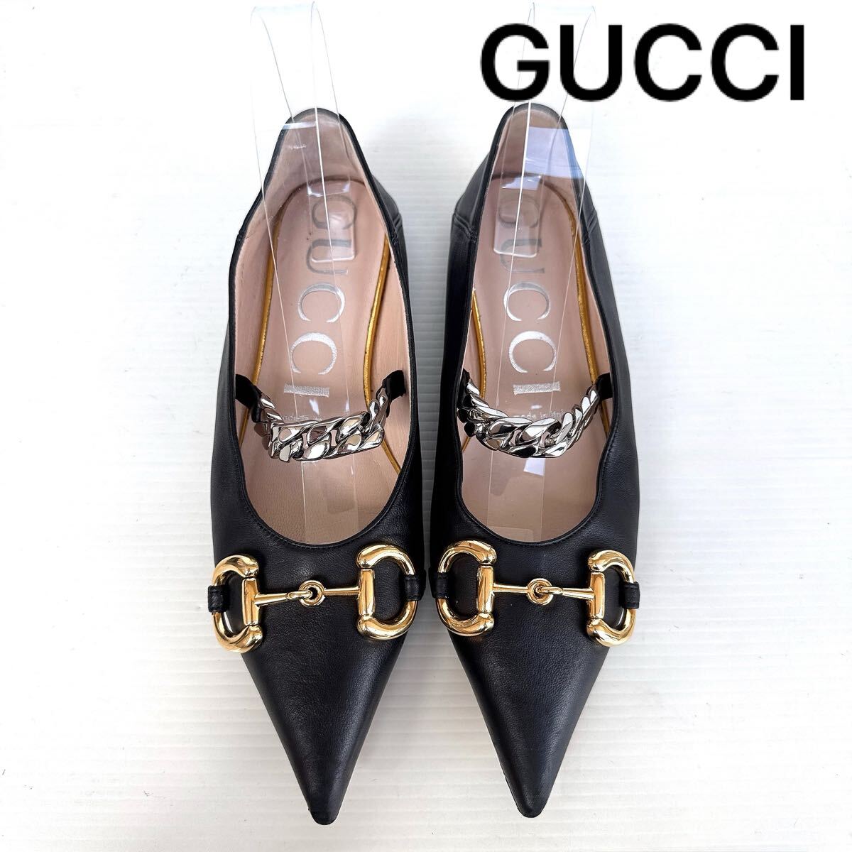 - GUCCI グッチ ポインテッドトゥ チェーン フラットシューズ パンプス バレリーナ ホースビット ミュール 美品 37 靴 ドライビングシューズ
