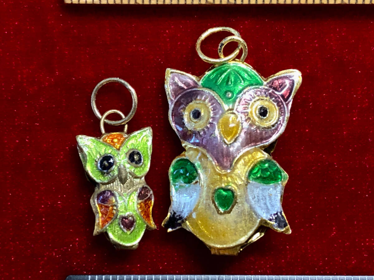 > ¶!¶ 有線七宝焼ワールド - ペア(大小各1)のフクロウ不苦労で1単位 ¶!¶ 金線に緑と褐土色釉橙と緑水色2種羽 手作 手芸 工芸 インテリア
