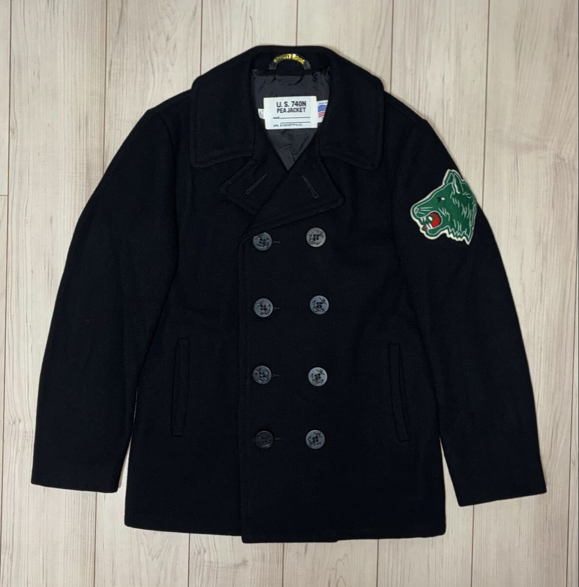 > 良品 Schott 753UB 24oz ワッペン Pコート 38 ショット ピーコート スリムフィット タイト 濃紺 黒 ブラック 753US GREEN RIVER タイガー