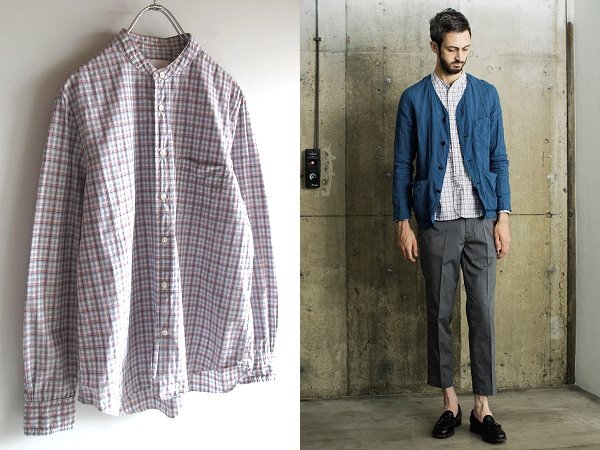 > LOOK使用 STILL BY HAND スティルバイハンド コットン バンドカラーシャツ チェックシャツ 46 ホワイト ライトブルー ブラウン レッド
