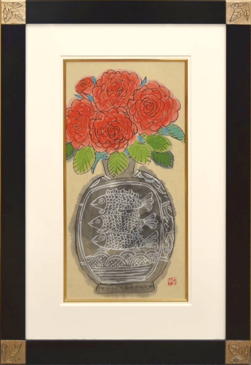 - 【真作保証】青木乃里子「赤薔薇圖」水墨岩彩画/本人直筆裏書あり
