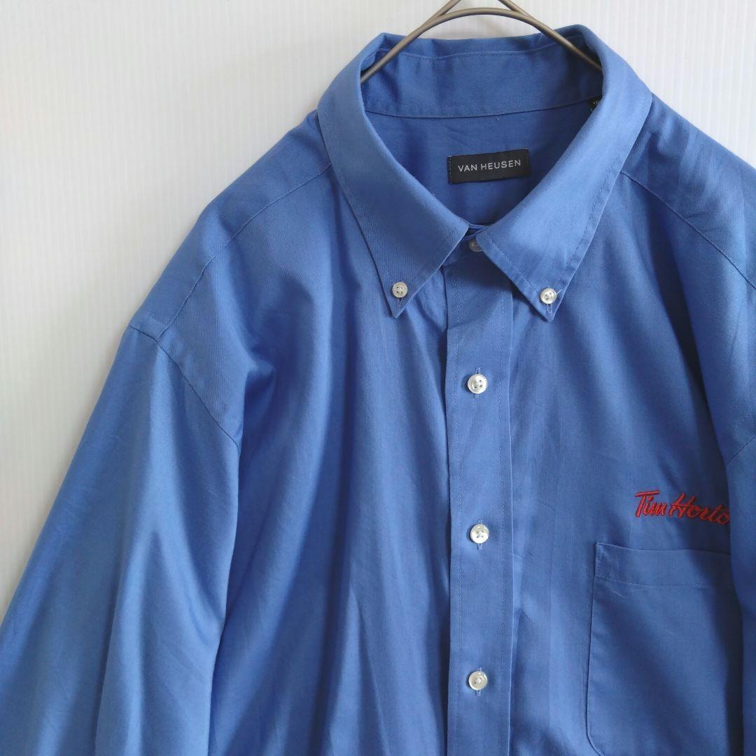 - 2505 VAN HEUSEN 長袖ワークシャツ M 青 刺繍ロゴ US古着