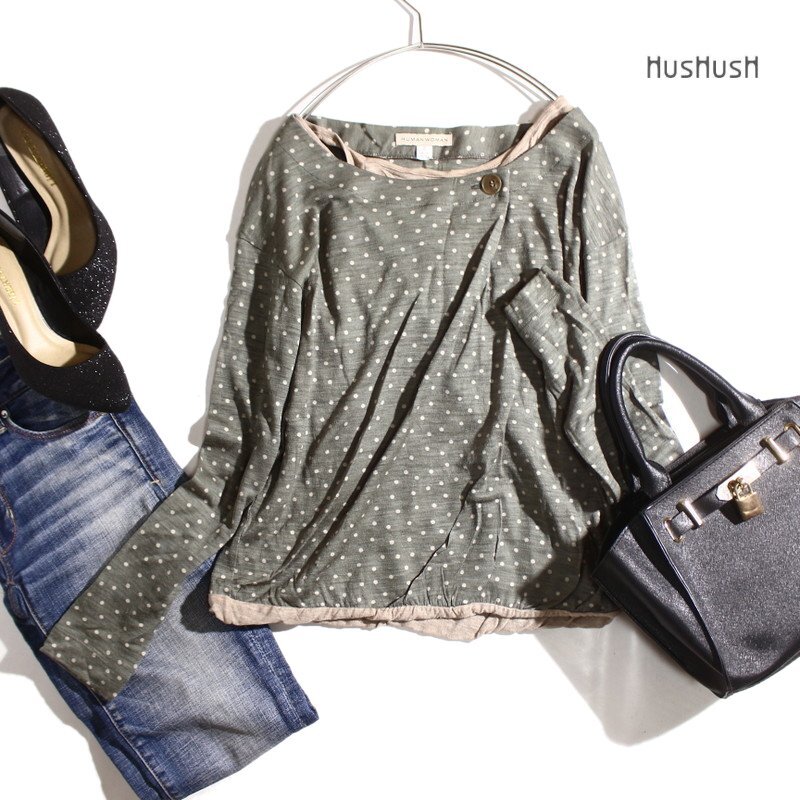 - 美品 ヒューマンウーマン HUMAN WOMAN 秋 冬 インナー一体 ドット 柄 デザイン ウール 長袖 ニットカットソー 9号 2 くすみ グリーン 緑