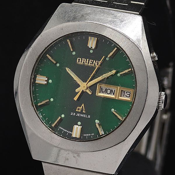 - オリエント AT/自動巻 TE429-30660CU デイデイト 23石 カットガラス ラウンド グリーン文字盤 メンズ腕時計 STU
