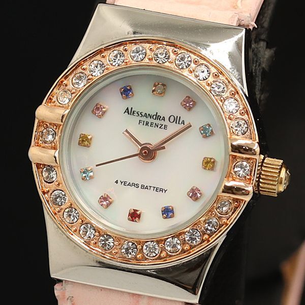 - 稼動 良品 アレサンドラオーラ A0-110-2 QZ シェル文字盤 カラーストーン付 ダイヤベゼル レディース腕時計 OGI