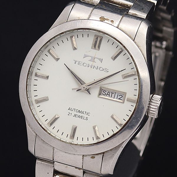 - テクノス AT/自動巻 T1076 21石 白文字盤 デイデイト 裏スケ メンズ腕時計 NKG