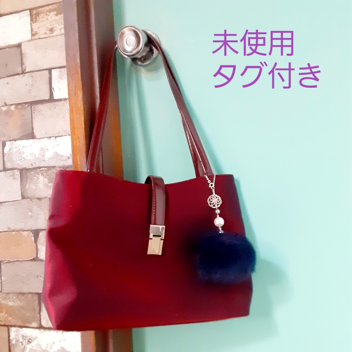 - ショルダーバッグ 赤 バッグチャーム付き ファー ポンポン 黒