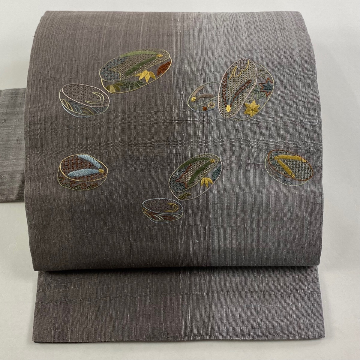 > 名古屋帯 美品 秀品 紬地 ぽっくり 刺繍 金糸 灰紫 正絹 【中古】
