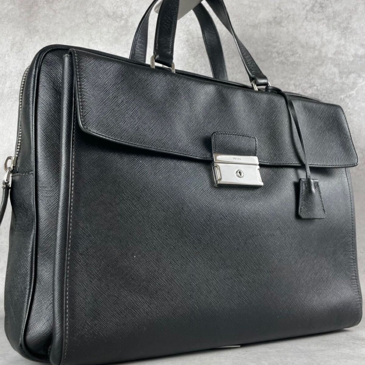 - 【美品】PRADA プラダ トートバッグ ハンド メンズ ビジネス ロック 金具 サフィアーノ レザー 本革 黒 ブラック A4/PC◎ 大容量 肩がけ