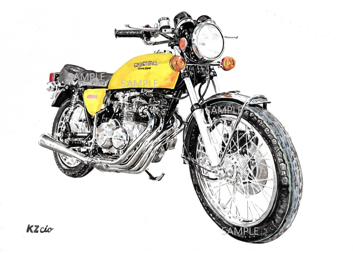 - A4プリントです ホンダ CB400FOUR ヨンフォア黄色 水彩画 バイクイラスト