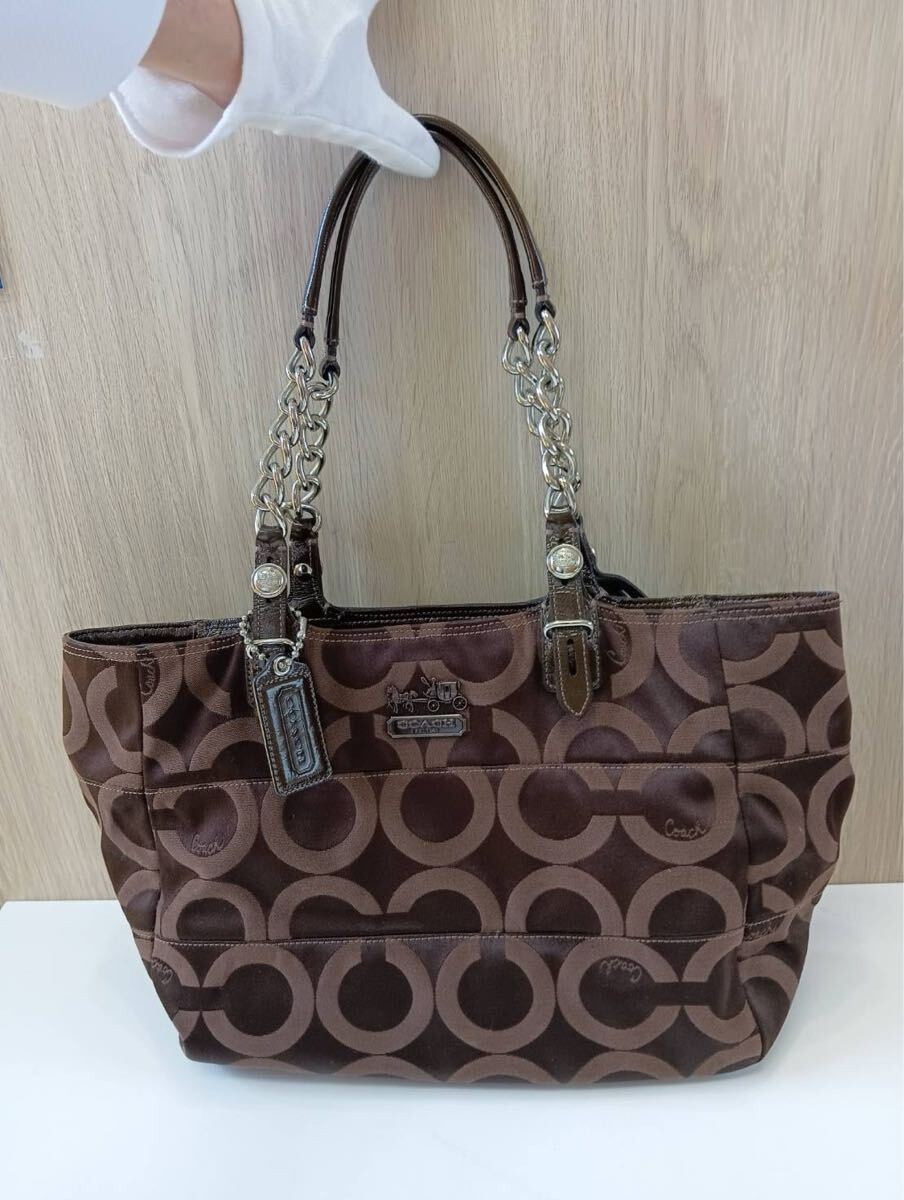 > 【中古品】COACHコーチ オプアート トートバッグ 茶ブラウン キャンバス×レザー 馬車金具 肩掛け 手提げ バッグかばん 現状品