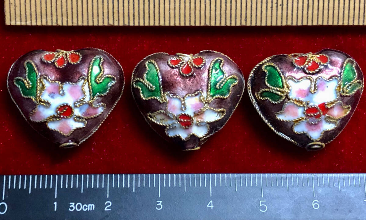 > ¶!¶ 有線七宝焼ワールド - 3個の大ハート型ペンダント ¶!¶ 約厚9㎜×横22㎜×縦19㎜ 金線褐色釉ピンク花芯 手作 手芸 工芸 インテリア