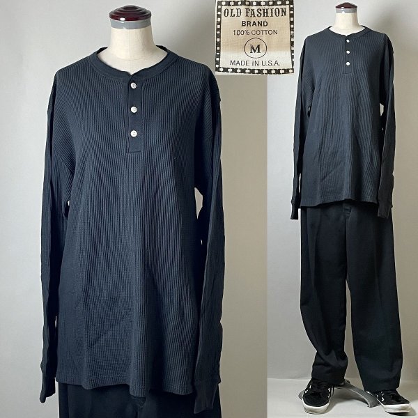 > ★USA製【美品 希少 名作インナー】★OLD FASHION オールドファッション コットン ヘンリーネック ワッフル サーマル 長袖 ロンT Tシャツ M