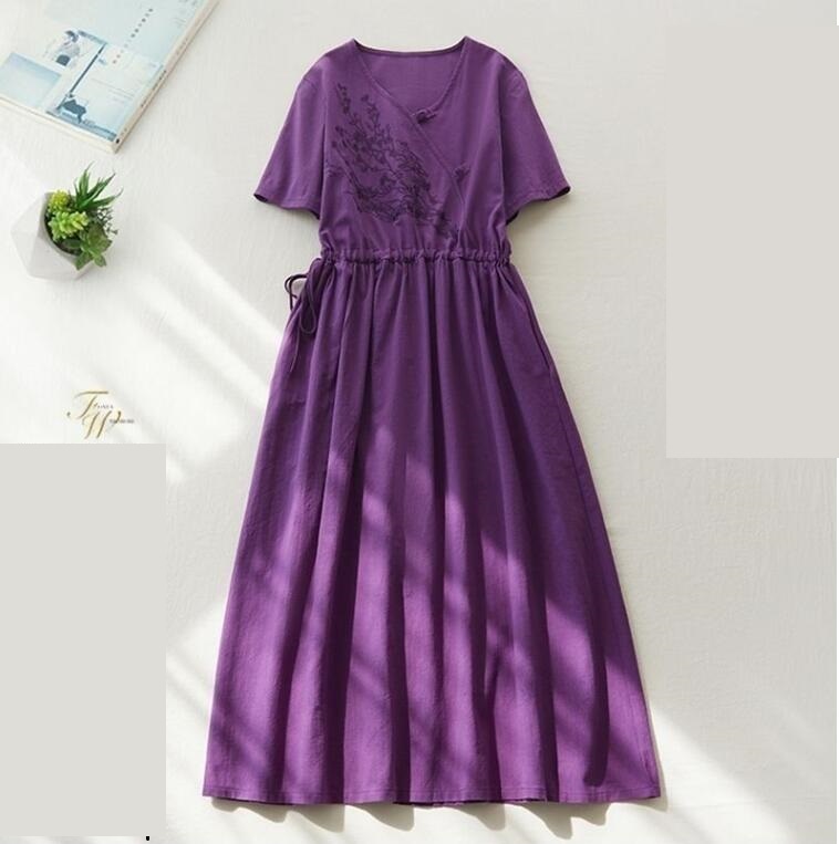 > 人気夏物お色選択可マキシ丈ワンピース半袖リネンワンピースキレイめ刺繍入り大きいサイズゆるシルエットロングワンピースパープルM-2XL