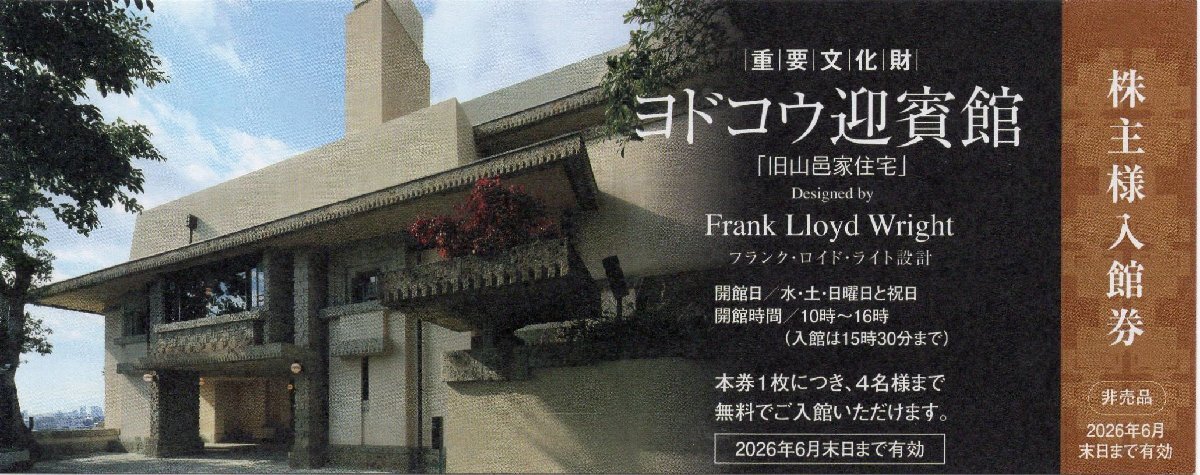 - [6].ヨドコウ迎賓館(旧山邑家住宅/兵庫県芦屋市) フランク・ロイド・ライト 淀川製鋼所 株主様入館券(1枚で4名様無料) 2026/6/30期限 1-5枚