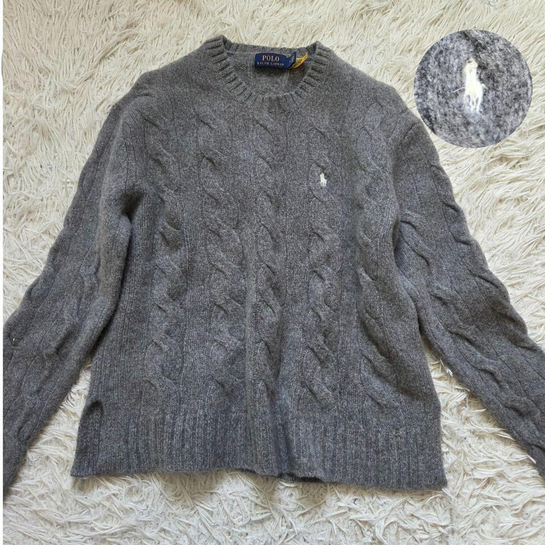 > 現行 ポロラルフローレン カシミヤ100 ケーブルニット ホースロゴ 刺繍 qrタグ PoloRALPH LAUREN グレー M