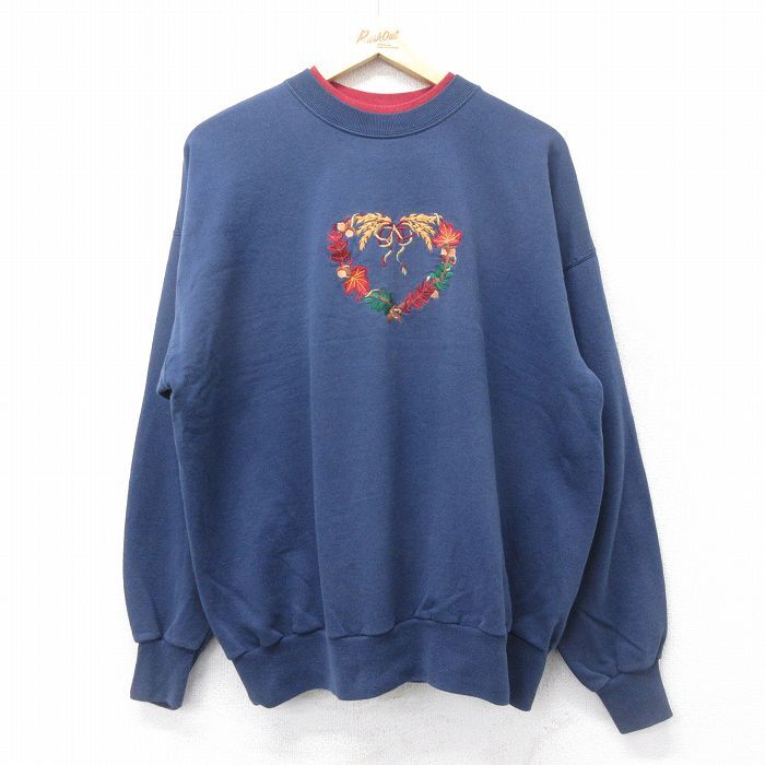 > 古着 長袖 スウェット レディース 00s 葉 ハート 刺繍 モックネック ハイネック 紺他 ネイビー 24oct18 中古 スエット トレ