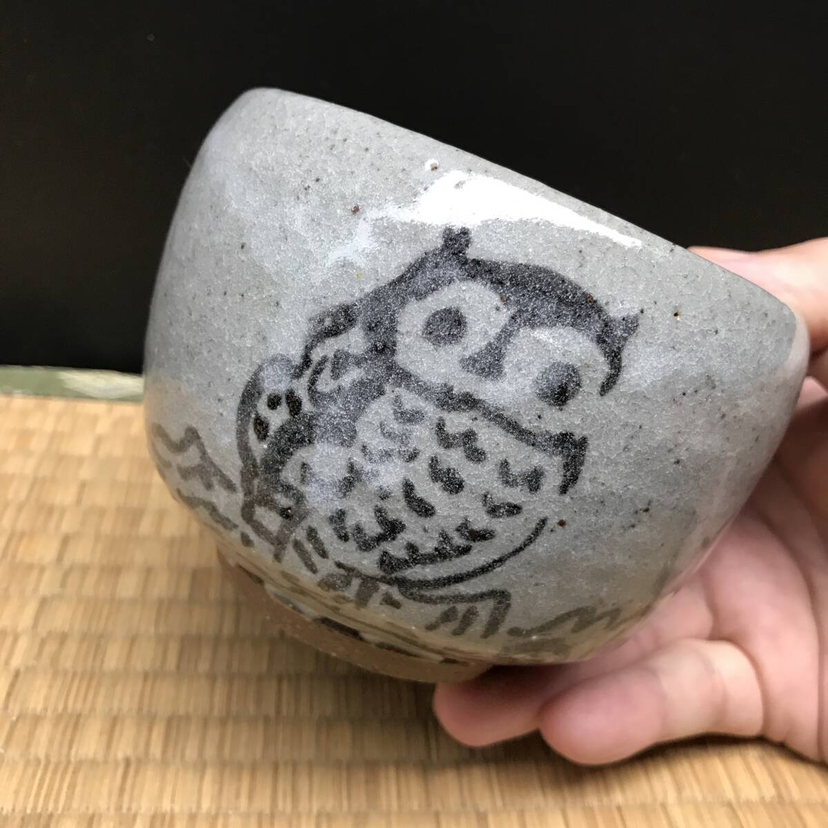 - ふくろう絵文のお茶碗、バーナードリーチ銘印?茶器 茶入 小鉢 杯 珍味入れ(R70913_A)
