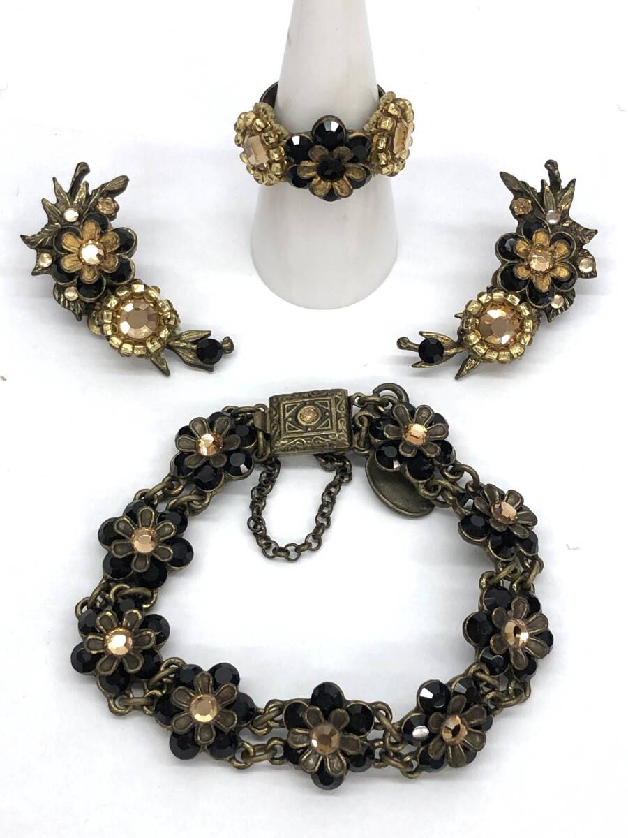 > Michal Negrin ミハエルネグリン イヤリング 指輪 リング ブレスレット 花モチーフ 3点セット ブラック系 アンティーク 服飾小物 保管8