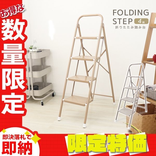 - 【限定セール】脚立 踏み台 4段 折りたたみ ステップ台 耐荷重150kg おしゃれ 滑り止め ステップチェア ステップスツール はしご ベージュ