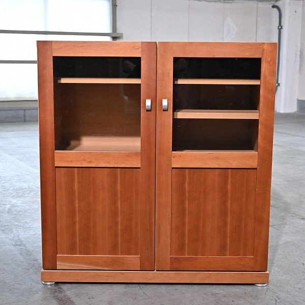 - ナチュラルモダン キャビネット チェリー材 両開き 木製 ガラス扉 飾り棚 食器棚 収納家具 リビング ダイニング 玄関 ディスプレイ 店舗
