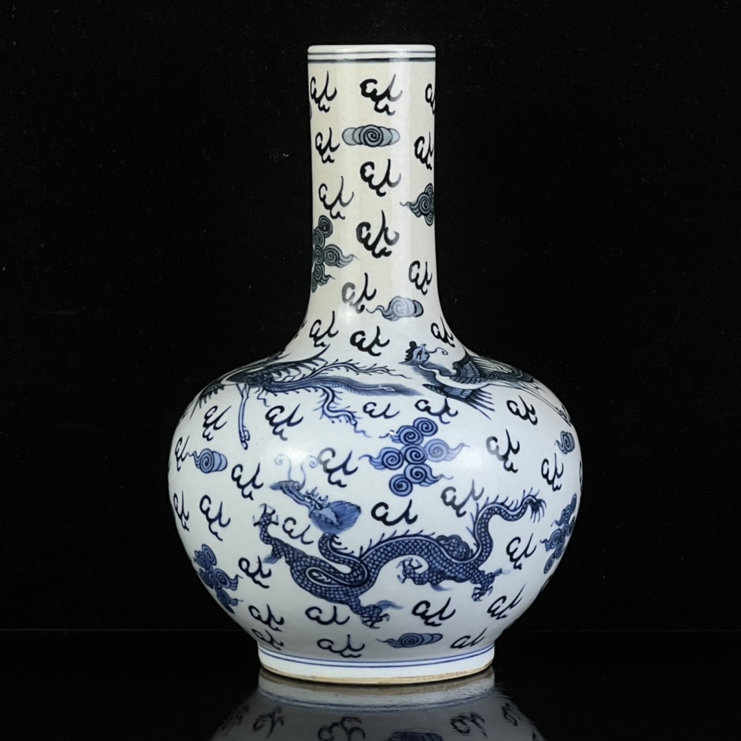 - 清時代 康熙年製款 古陶磁器 青花 龍鳳紋 天球瓶 花瓶 賞物 磁器 陶芸 擺件 時代物 古董品 骨董 旧家蔵出 唐物 中国古玩 古美術品