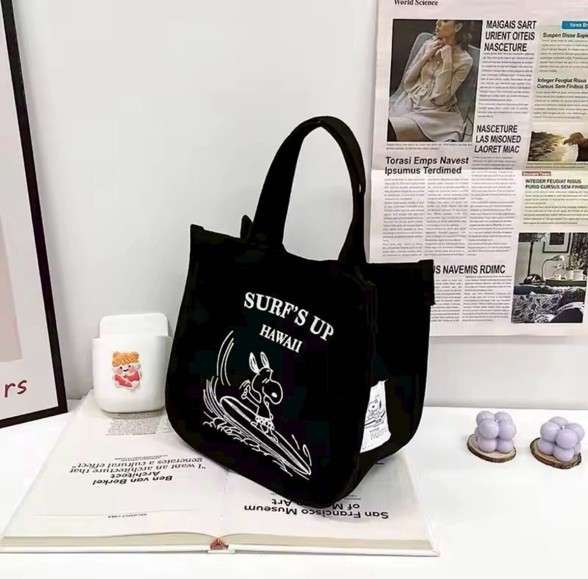 - 【新品未使用】スヌーピー サーフィン ランチバック ハンドバッグ バッグ キャンバス ブラック 黒