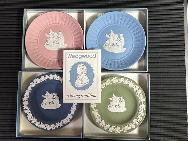 > ◎ウェッジウッド ピンク・ブルー・紺色・グリーン ジャスパー 小型プレート4枚セット 「飛ぶ馬」◎z76箱付