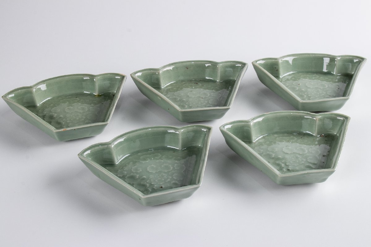 - 【うつわ】 三田青磁 陽刻牡丹文変り形皿 5客 E1918 バラ売り可能です 古美術 骨董 古玩 陶磁器 和食器 懐石 料亭