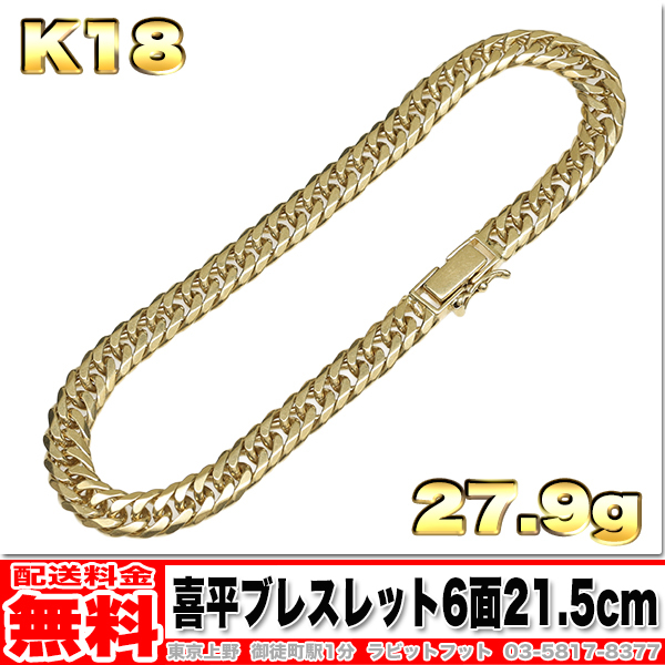 - 【送料無料】18金 喜平 ブレスレット 6面 ダブル 27.93g 21.5cm ◆ K18 30g くらいでお探しの方いかがでしょうか。 (中古)