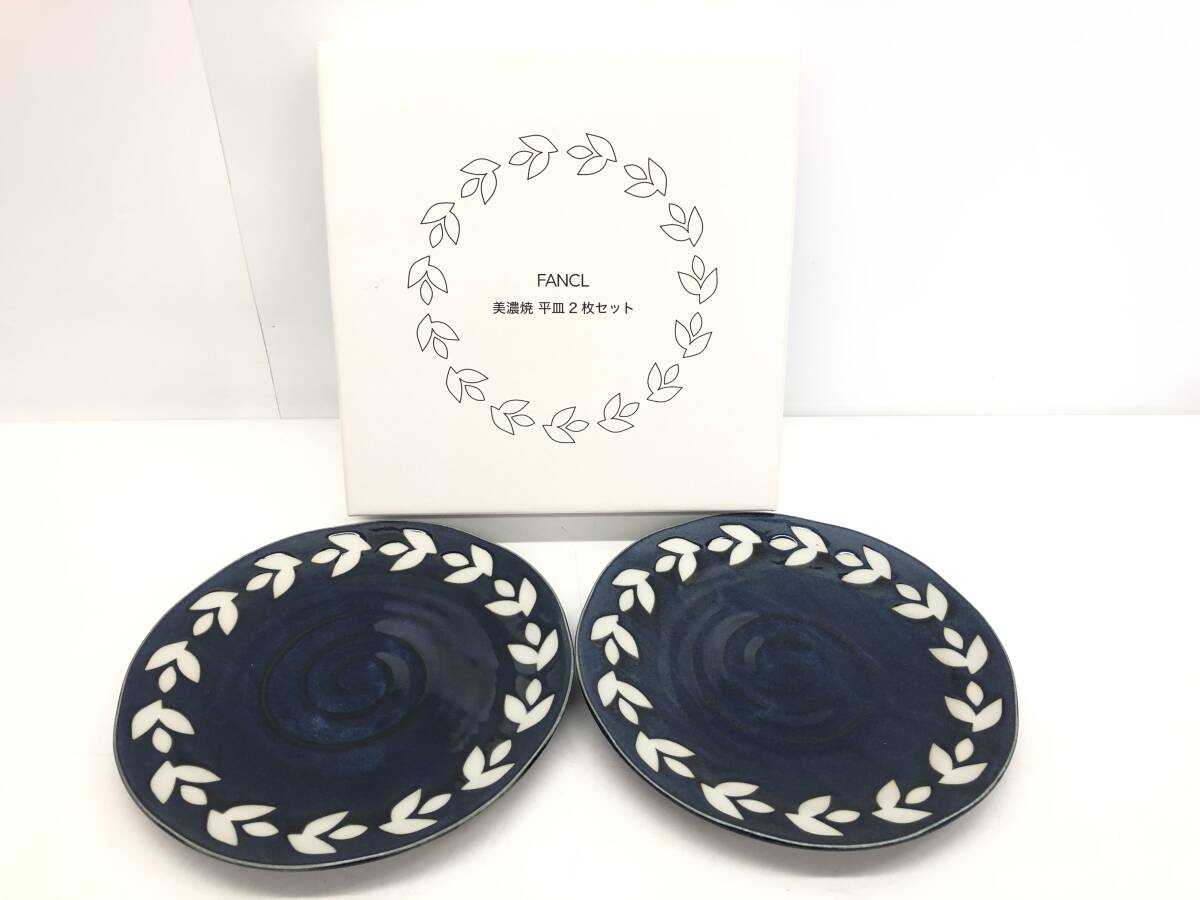 > 未使用 FANCL ファンケル 美濃焼 平皿 2枚セット 皿 お皿 プレート 盛皿 丸皿 葉模様 リーフ模様 紺 ネイビー 直径19㎝ 食器 陶磁器 箱付