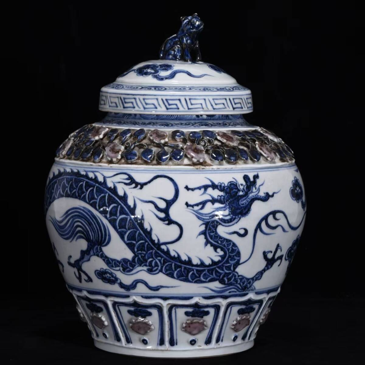 > 磁器 元時代 青花釉里紅捏花龍紋蓋罐・甕 秘蔵 33.5cm古陶磁器 陶芸 唐物 古賞物 時代物 骨董品古置物 極細工 中国磁器 古美味 中国古玩921