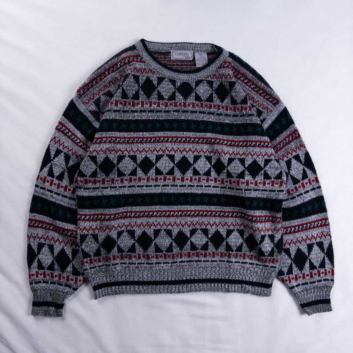 > US Vintage 90s Celebrity Club アクリル100% 幾何学模様 アート 装飾 オーナメント クレイジーパターン ボーダー 総柄 デザインニット