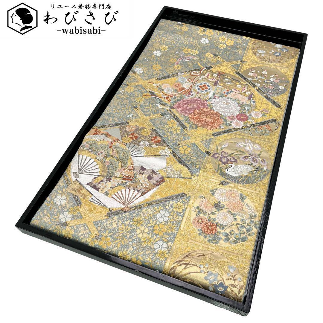 - 袋帯 本金箔 天井絵風雅佳苑 扇子に美しい花模様 金色 フォーマル O-4252