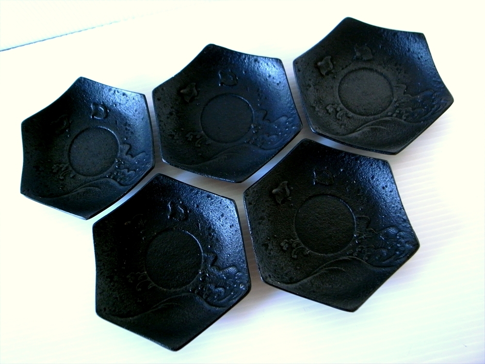 - 南部鉄器 岩鋳 波千鳥 六角 茶托 5枚組 日本茶 煎茶道具