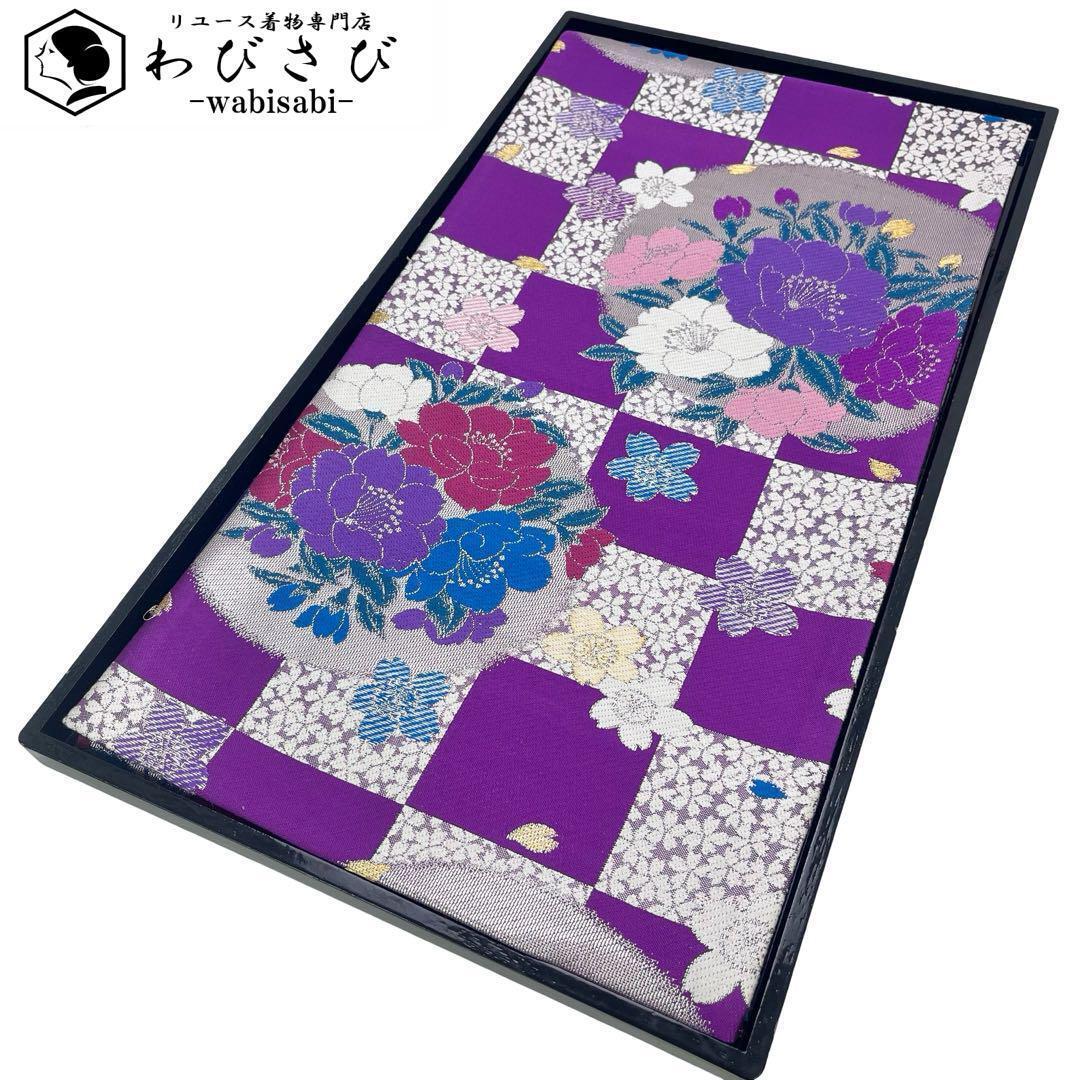 - 袋帯 市松に花模様 チェック柄 金銀糸 紫色 振袖 O-4370 着物 きもの kimono 和服 和装 中古 リサイクル着物 【送料無料】
