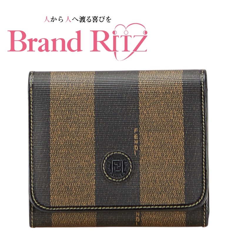 - 中古 フェンディ ペカン 三つ折り財布 ABランク ブラック FF ブラウン PVC レザー レディース FENDI 【西神店】