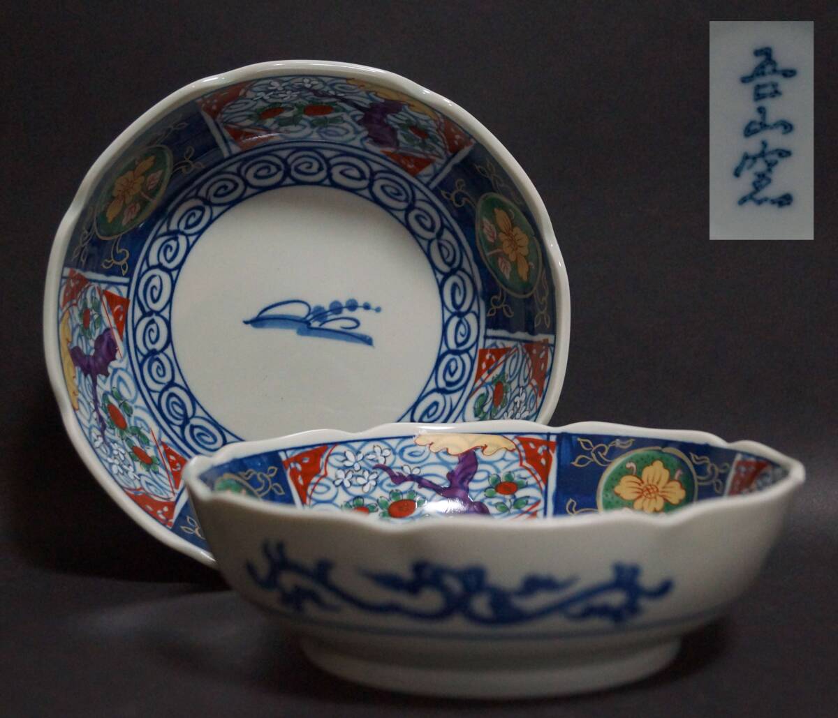- 【芸】有田焼 吾山窯 金彩色絵『花文』皿 鉢 中鉢 懐石道具 二客セット s70919
