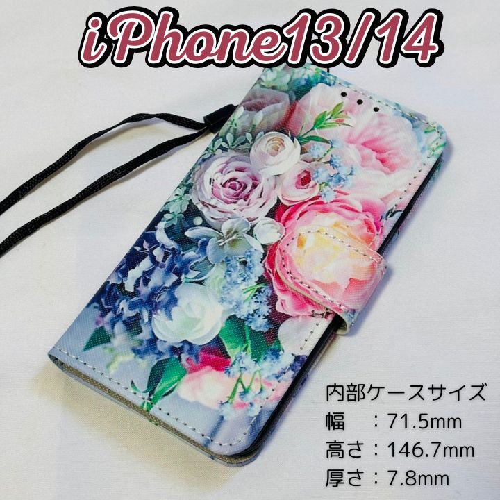 - iPhone13/iPhone14 花柄手帳型スマホケース 高級PUレザー使用 カードポケット・スタンド機能つき