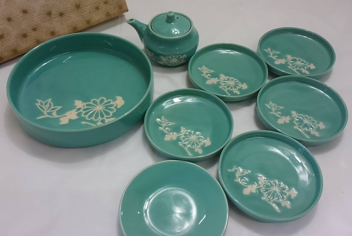 - 【菊水-541】■■希少■美品■陶器 ヒスイ菊抜漬物セット■【小皿・小鉢×5・中鉢・醤油さし】■(IS)
