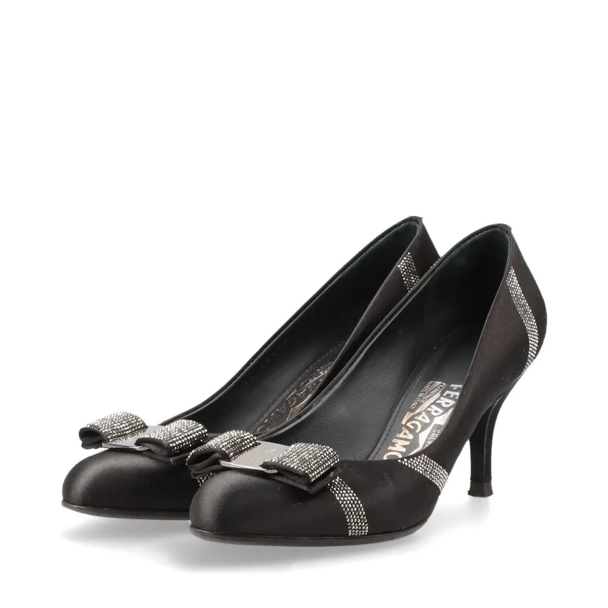 - 1円■美品■サルヴァトーレフェラガモ■ヴァラリボン パンプス サテン ラインストーン 6 23.5cm 靴 ブラック 黒 レディース MMM CQ50-6