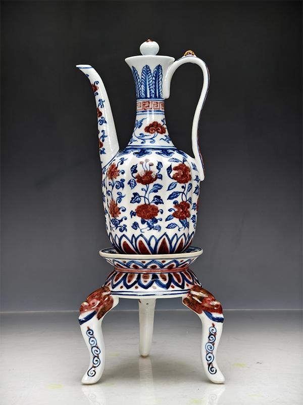 - zz9|9466 中国磁器 陶芸 磁器『【大明宣徳制】通景満工青花釉里紅花卉紋分体執壺です。』施釉陶 古代工芸品 陶芸 精美彫 置物 收藏品