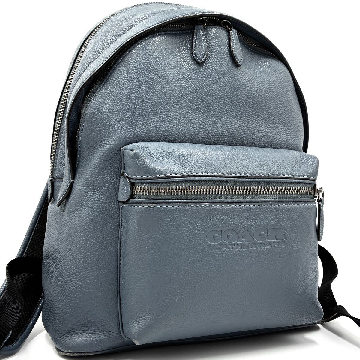 > 1円 現行モデル COACH コーチ チャーター リュック バックパック メンズ ビジネス オールレザー 本革 シボ革 ロゴ型押 ライトブルー 大容量