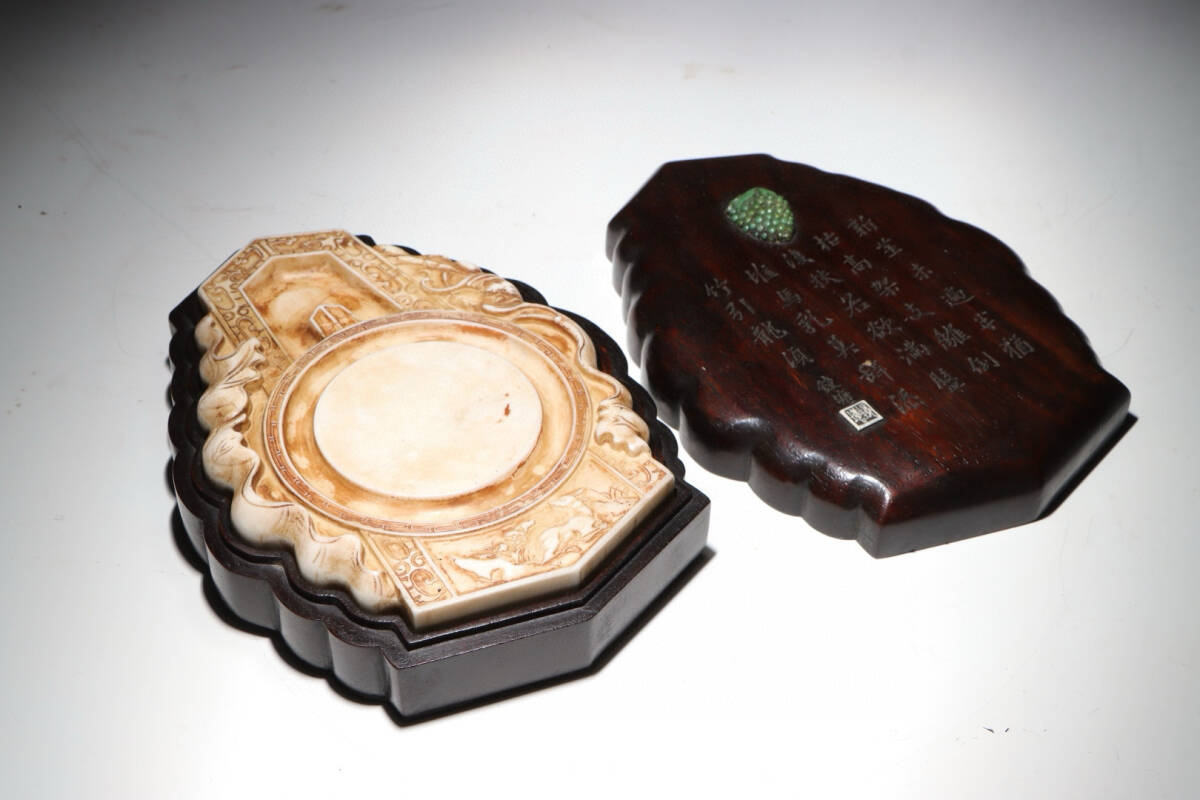 > 『古』清代[硯台 老坑 端溪] 重量1011g 硯台 端石 漢詩文 浮彫 骨董 端渓 硯 文房具 中国古硯 書道具 擺件 蔵出